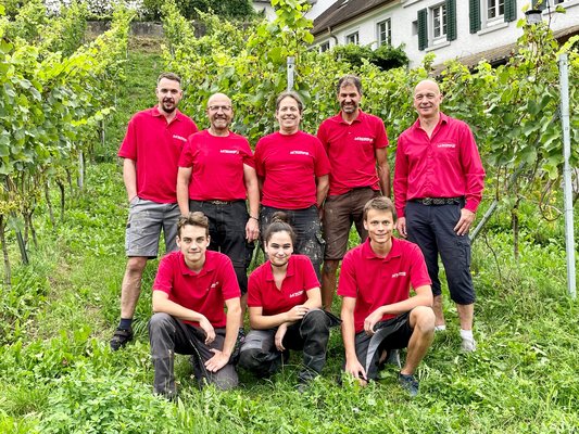 vlnr (hinten): Alexander Stepin, Peter Brandenberger, Reto Mathys, Kurt Baggenstoss, Erich Jakob Graf (Inhaber und Geschäftsführer). vlnr (vorne): Severin Bollinger, Sofia Göbel Gonzalez und Roman Meier.